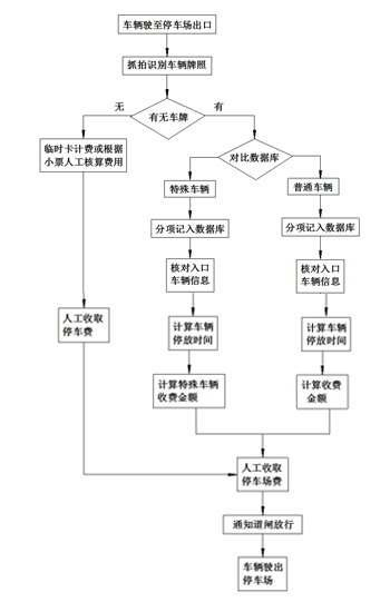 “出口系统”主要由ZQQM高清车牌识别设备、拍照补光设备、终端管理设备、数据传输设备及应用软件等组成。主要作用为记录出口车辆的全部信息、比对车辆数据库车辆性质、比对入口车辆数据库收取停车费、内部车辆的无障碍通行、无牌照车辆刷卡通行。