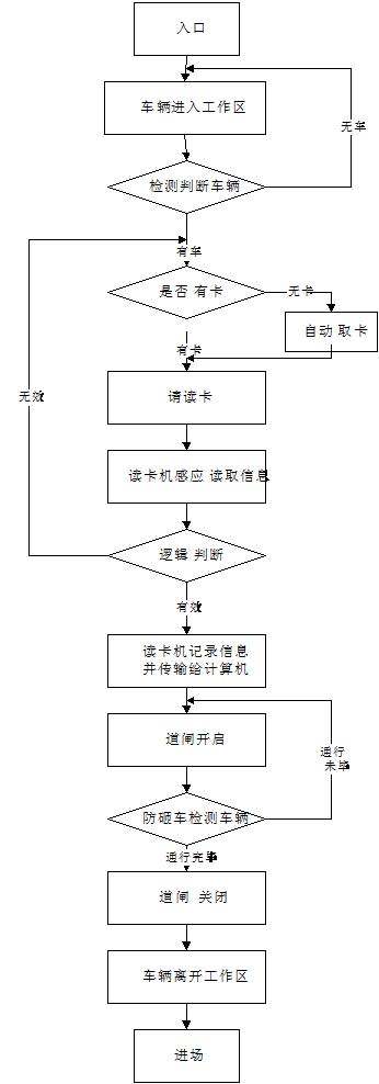 出入场时,临时车取卡、月卡、储值等有效卡刷卡,栏杆自动抬起,车辆驶出通道(即过车辆检测器感应线圈的感应区域)后,栏杆自动落下。