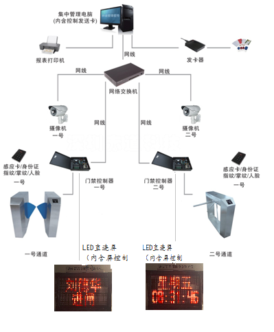 主要由计算机/打印机、智能读卡器、智能控制器、摄像机、视频服务器、智能闸机、智能卡及管理软件等组成。采用TCP/IP网络结构通讯,通讯距离可无限扩展,单台计算机可接任意数量智能闸机。智能闸机,既可联网运行,又可脱机运行。系统组成图如下: