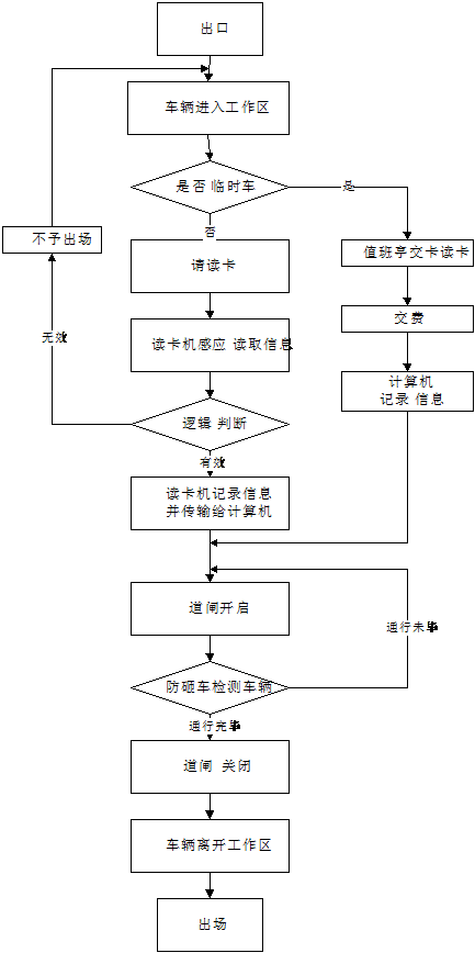 出入场时,临时车取卡、月卡、储值等有效卡刷卡,栏杆自动抬起,车辆驶出通道(即过车辆检测器感应线圈的感应区域)后,栏杆自动落下。